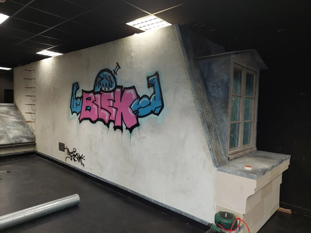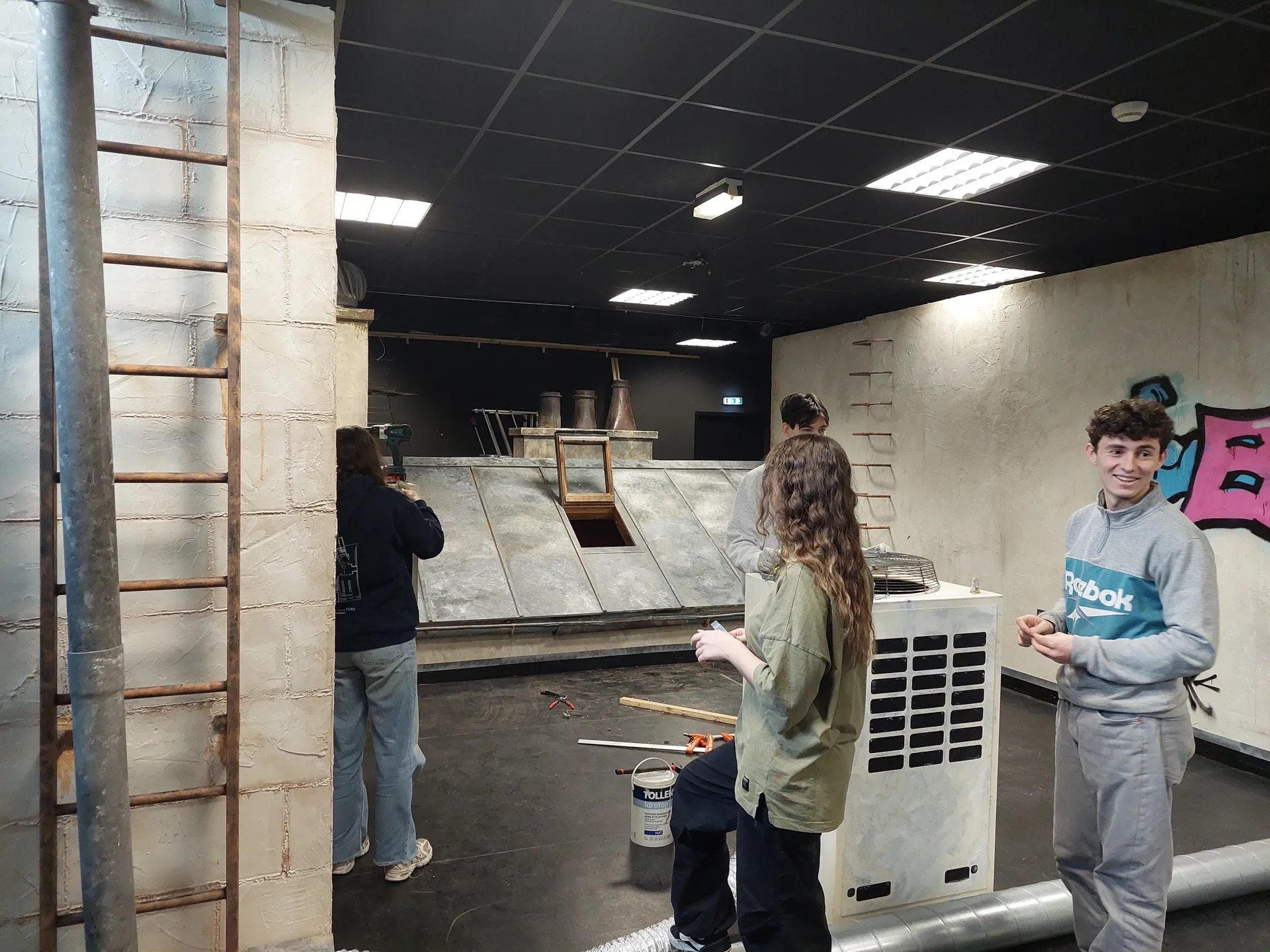 Pour la 4e année, une petite équipe issue de l’école Kourtrajmé Montfermeil participe à cet atelier de tournage sur plateau, en direct et en public, qui associe les étudiants du Conservatoire d’art dramatique, de l’Ecole d’Architecture de Clermont, et d’autres formations encore. Pour le décor des toits de Paris proposé cette année, deux anciens étudiants Scénario, Marouane Ben Jaoued et Julien Bounkaï, ont écrit leur comédie décalée « Graffiti dans la nuit »: comment quatre apprentis graffeurs, en quête de reconnaissance, se disputent pour inaugurer un nouveau spot idéal, un grand mur tout fraichement repeint…